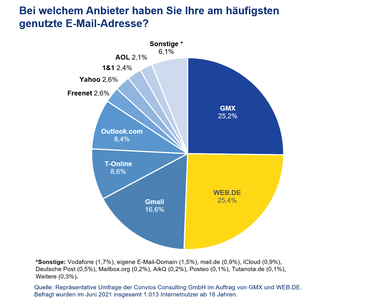 Laut einer repräsentativen Studie von Convios Consulting sind WEB.DE (25,4 %) und GMX (25,2 %) die mit Abstand beliebtesten E-Mail-Portale der User in Deutschland. Gemeinsam decken sie mit einem Anteil von 50,5 Prozent mehr als die Hälfte des E-Mail-Marktes hierzulande ab.