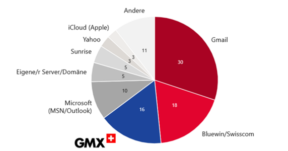 16 Prozent der deutschsprachigen Onliner in der Schweiz nutzen GMX.ch als Haupt-E-Mail-Adresse. Damit zählt GMX zu den drei führenden E-Mail-Anbietern. Mit 30 Prozent führt Google, gefolgt von Bluewin/Swisscom mit 18 Prozent. Deutlich dahinter liegen Microsoft (10 %), eigene Server und Domänen (5 %) sowie Sunrise (5 %).